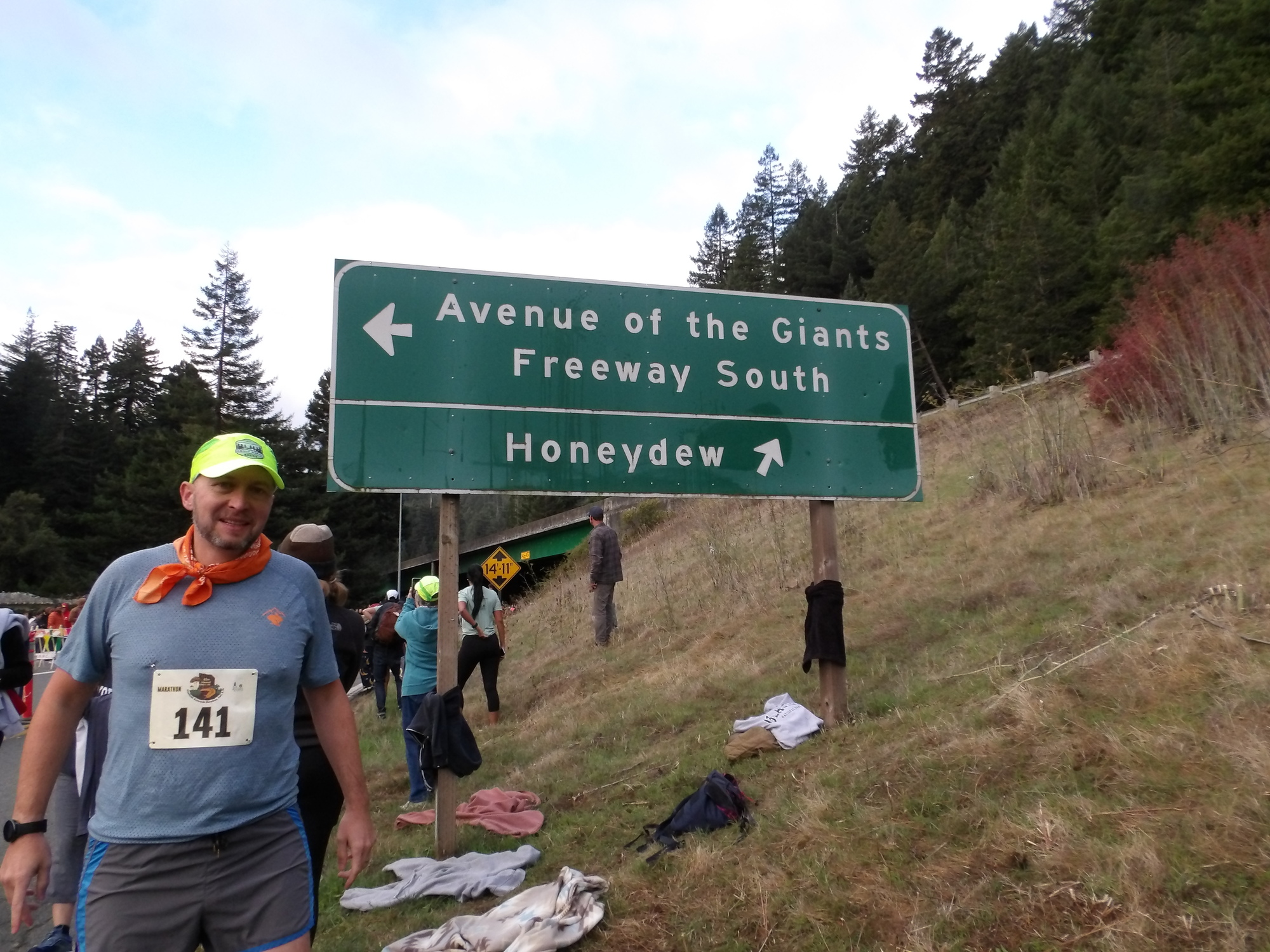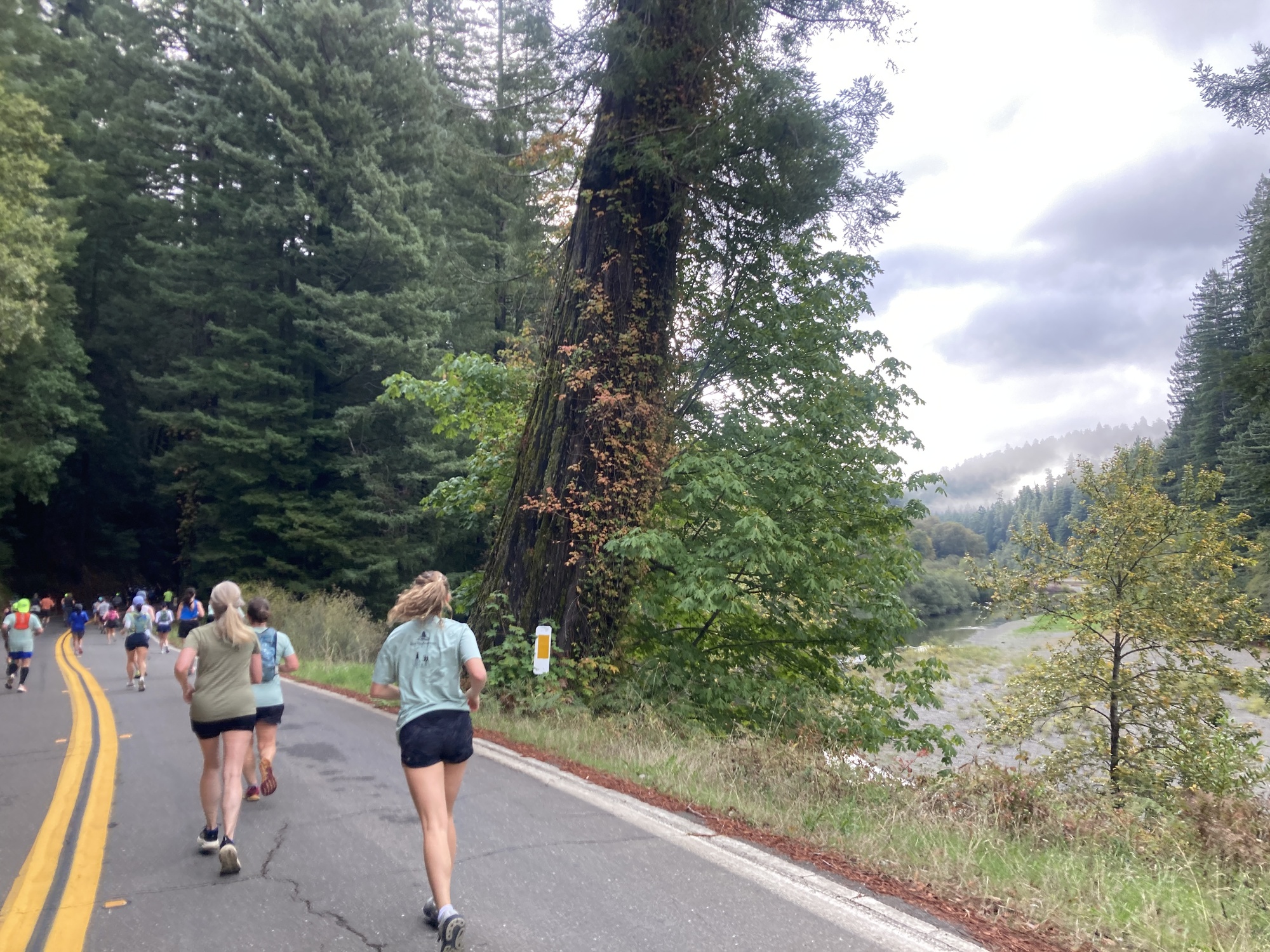 Both Humboldt Redwoods and the Avenue of the Giants marathons are organized by the same group, Six Rivers Running Club, and are run on essentially the same course, just in a flipped order. The course is basically an L, with the start and the finish at the corner point. Each leg of the L is a quarter-marathon long, so each out-and-back is a half marathon. One of the legs is on the famous Avenue of the Giants, which is a single lane sightseeing road through the massive California coastal redwoods, while the other leg is on Bull Creek Flats Road, also called Mattole Road on Google Maps. For "Avenue", you run the Bull Creek section first, and at least when I ran it, Marathon started before the half-marathon and the 10k. Those two races are run on the Avenue. This meant that you end up finishing with the tail end of the half-marathoners, who tend to be really slow and often take up the whole width of the road by casually walking side by side. So, just when you are tired and looking forward to finishing, you need to start doing a ton of zig-zagging. Humboldt, on the other hand, has you run on the Avenue with everyone else, so you also get the moral boost of being in a large pack at the start. In "Avenue" you are more solo at the beginning, since many fewer people run the full marathon.