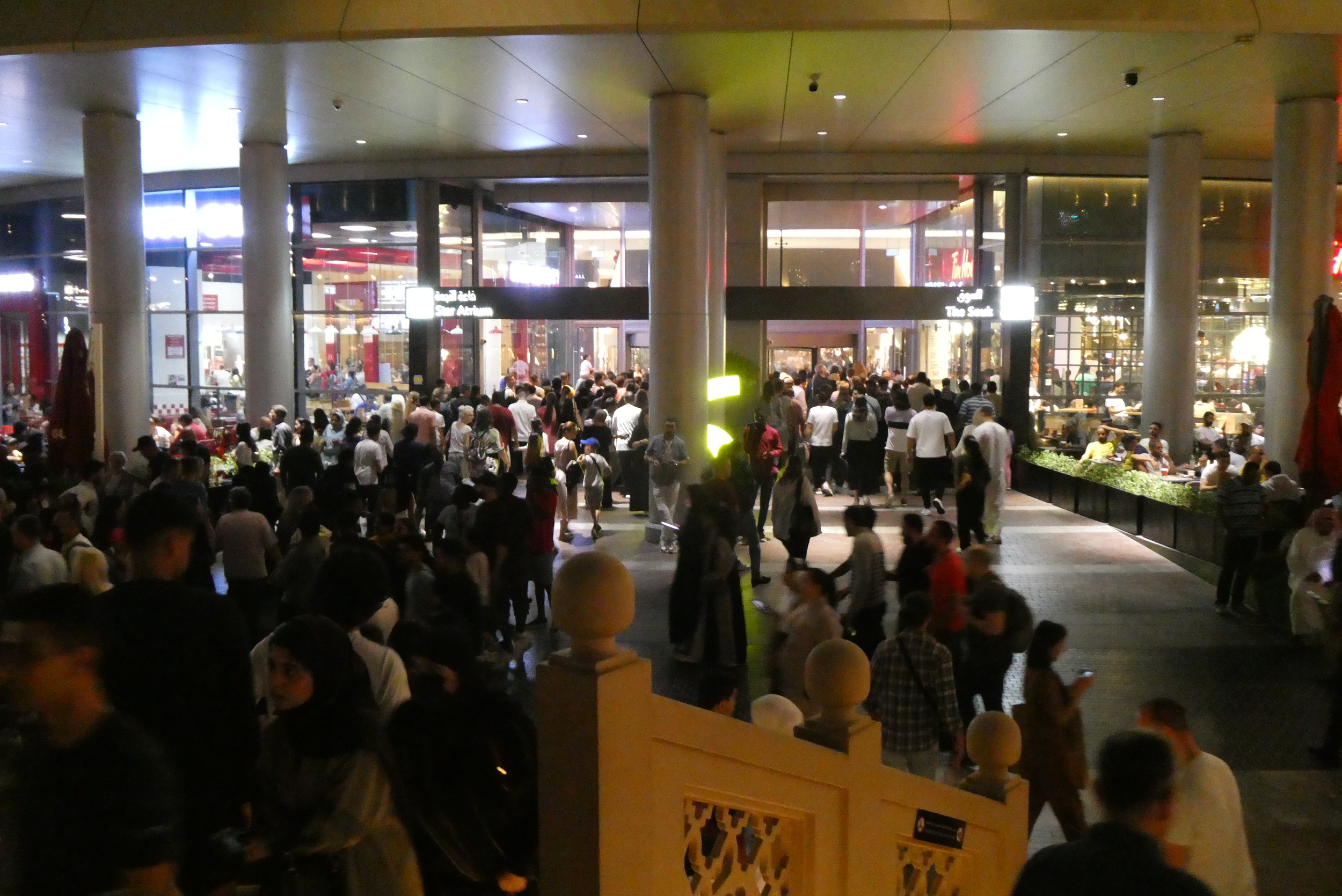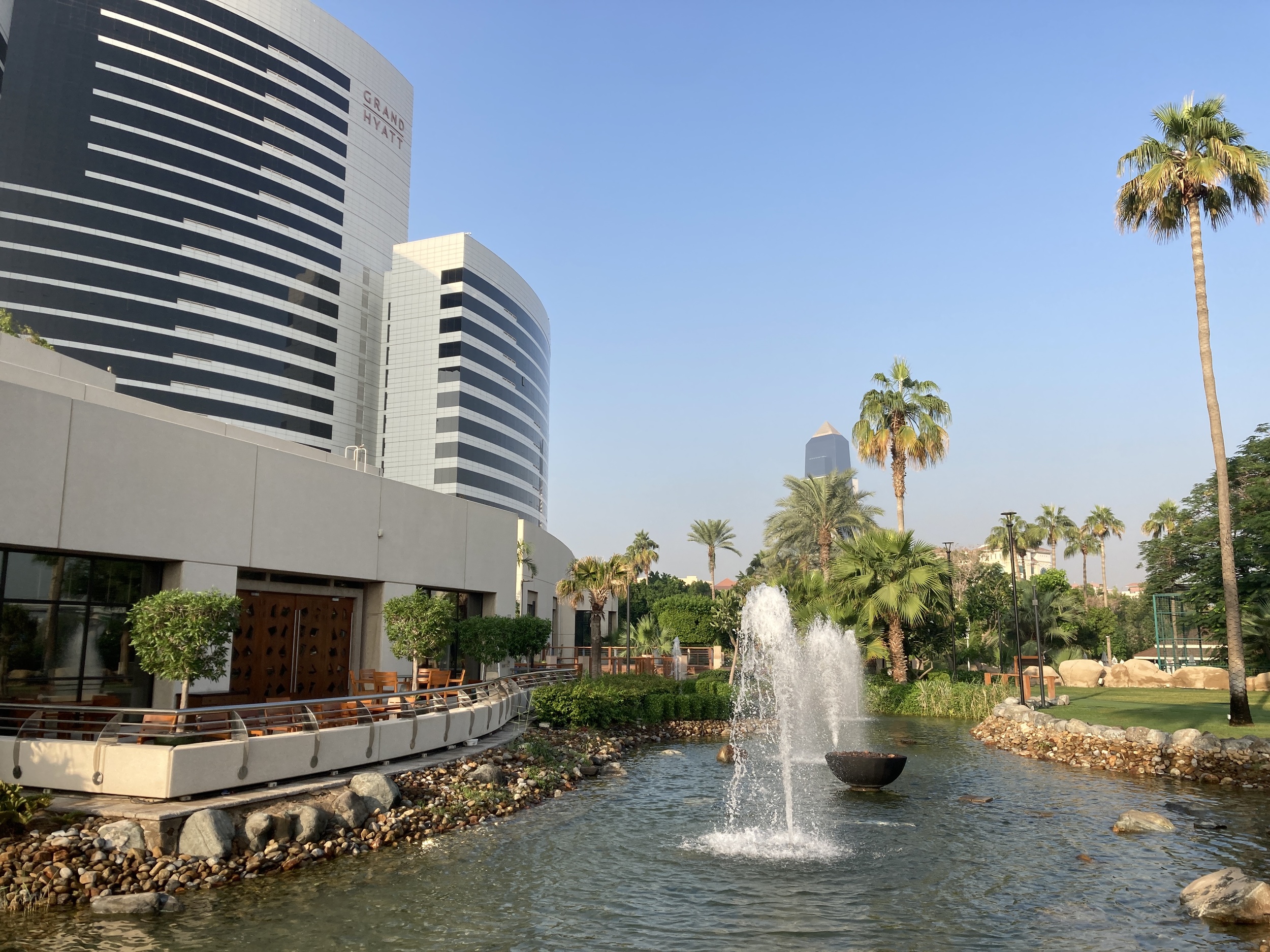 The flight itself was quite uneventful. Due to the rather complicated political situation, flights from Europe follow a narrow airway stradling the border of Iran and Iraq, as can also be seen from our route map. The flight got in at 11pm. This was our first time ever traveling to the Middle East and the airport was our first introduction to the Arabic culture. All immigration officers wear the white "tunics", called thawbs. These robes are just as commonplace as formal suits in the west, but to newcomers to the Arabic world as us, can be quite fascinating. After passing through immigration, we taxied over to the Grand Hyatt, where we stayed two nights for free thanks to a Hyatt annual free night awards. This is an impressive Hyatt property! The ground floor lobby is filled with tropical plants, and the outside is flanked by a massive pool and even an aviary housing multiple peacocks. The room from our our was quite impressive too, and gave me the chance to try out the new Panasonic Lumix DC-ZS80D camera bought for this trip for its impressive 30x optical zoom. It worked out pretty well, although as of writing this report in August 2024, I no longer have it. It fell during an excursion from a 2024 conference in Avignon, and the lens mechanism broke. I figured I'll just replace it but apparently there is currently a massive zoom compact camera shortage since this, and all other similar cameras like Sony Cybershot and Canon Powershot are sold out everywhere.