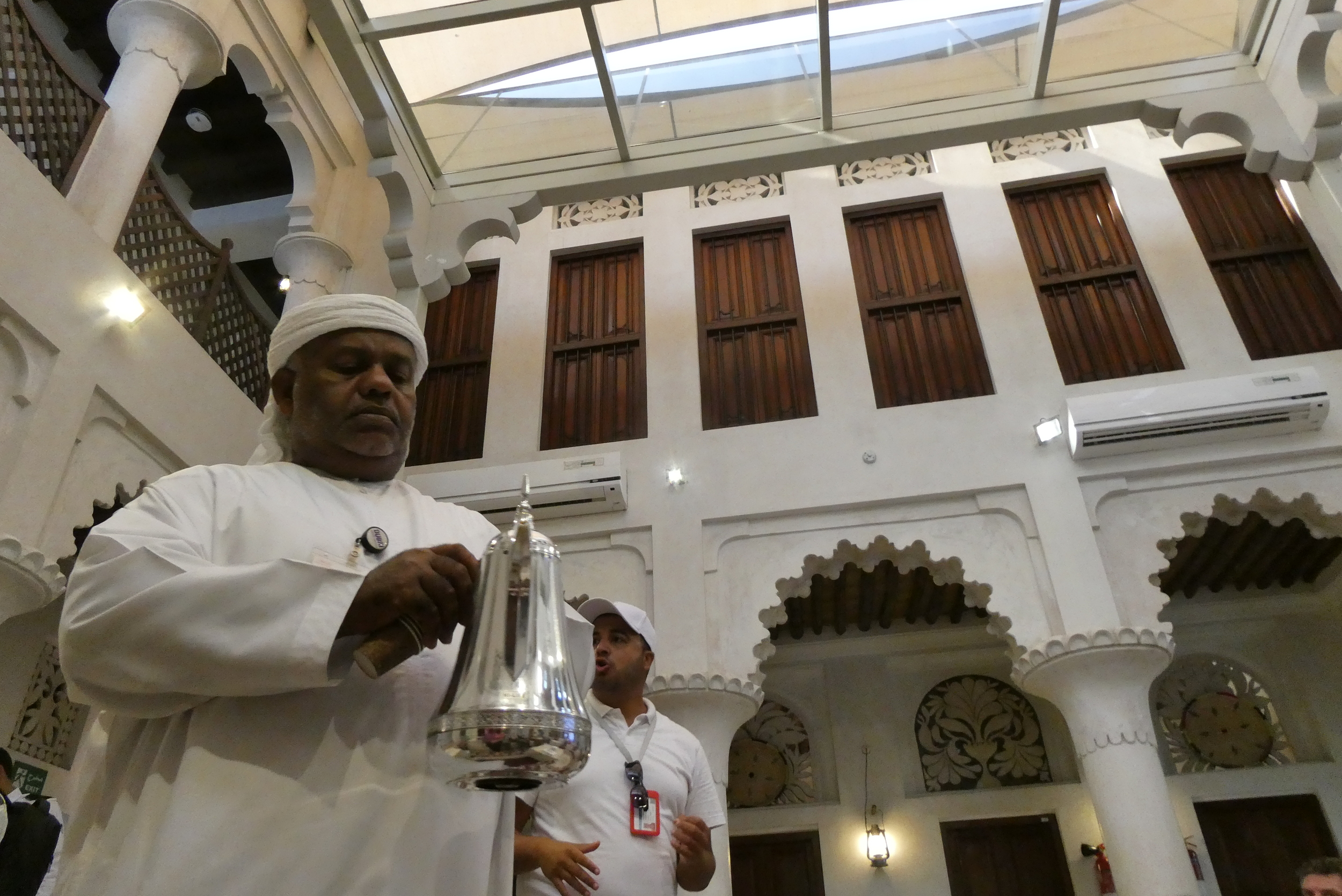 Our first sightseeing involved taking a taxi to "Al Seef", which is a historically-looking market area right on the Dubai Creek, across from the Deira neighborhood. Here we joined a tour group that took us first to the Al Fahidi historical neighborhood. This is where we got to see some true traditional houses and even enjoy tea inside of them. There was a tent set up demonstrating how the nomadic tribes used to live in the desert, even featuring a falcon. The houses were filled with manequins illustrating the use of different rooms for cooking, play, socializing, and religious studies. I very much enjoyed this part of the tour. Again, this was my first ever exposure to the Arabic world, and even if staged and somewhat artificial, it was still an experience I likely would not have had otherwise. We next made our way to the creek, where the group hopped onto two "abras", or traditional wooden boats that ferried us over to the opposite bank, where we first traversed a spice market and then found ourselves in the famous Gold Souk. This is a bazaar specializing in selling gold products. Some shops try to attract customers by demonstrating some truly ridiculous items, such as the massive ring shown below.