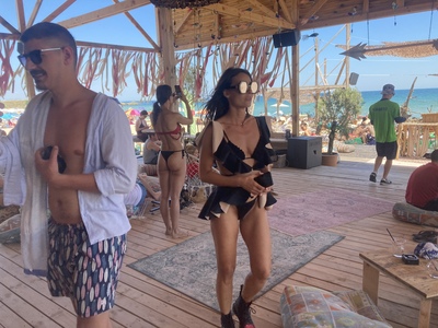 People watching here can be fascinating! Below are some samples from the beach "Gypsy" bar to show the local clientele. You definitely see more upscale look than you find at other Bulgarian resort towns like Sunny Beach, which tend to be dominated by foreigners looking for a cheap holiday. Lozenets is more the destination for the well off locals, and although you do hear the occasional foreign language (but not English, that is very rare), most people seemed to be Bulgarian. The outfits are also quite interesting and much more revealing than what one may find in the US. This was also true for staff: the lady in the octagonal sunglasses in the last picture was the hostess. And it was also true for men, as the picture in the second row clearly illustrates.